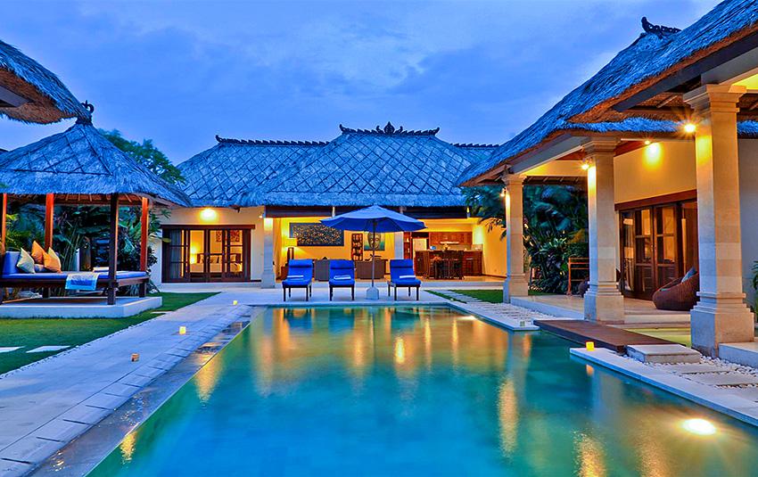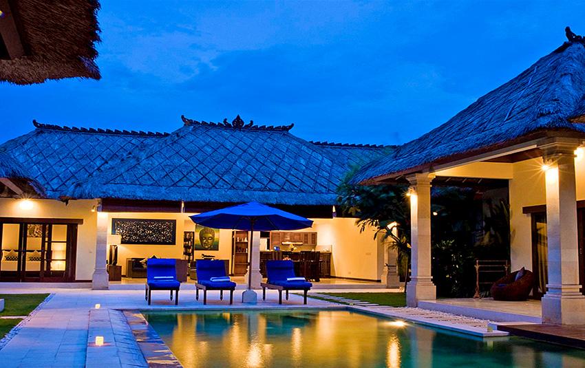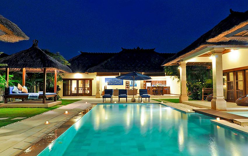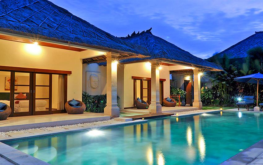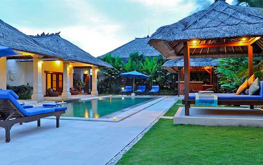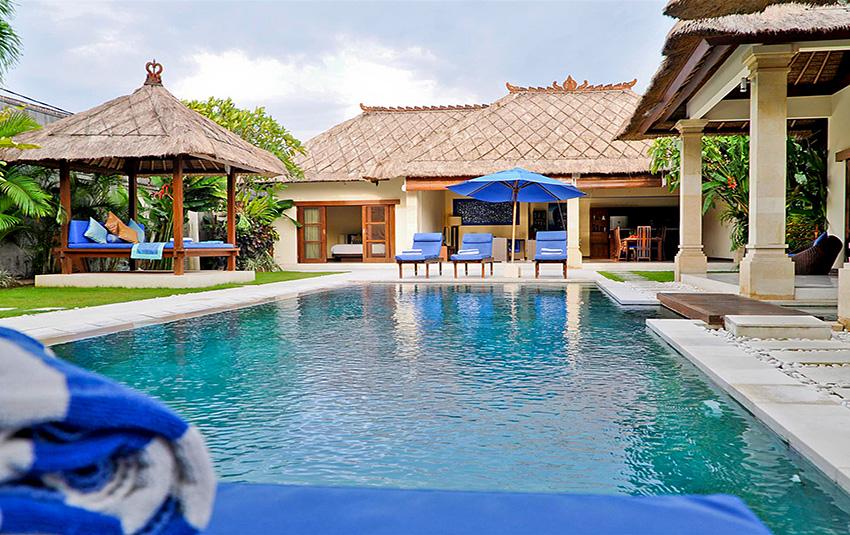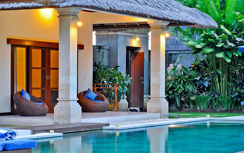 Grosse und Luxus Villa mit privatem Pool in Seminyak, auf Bali, Indonesien für 8 Personen. Die Villa liegt in einer residentiellen Umgebung, in der Nähe von Restaurants und Bars, Geschäften und Supermärkten, etwa 500 M entfernt vom Strand von Gado Gado und etwa 0,5 Km entfernt vom Indian Ocean.