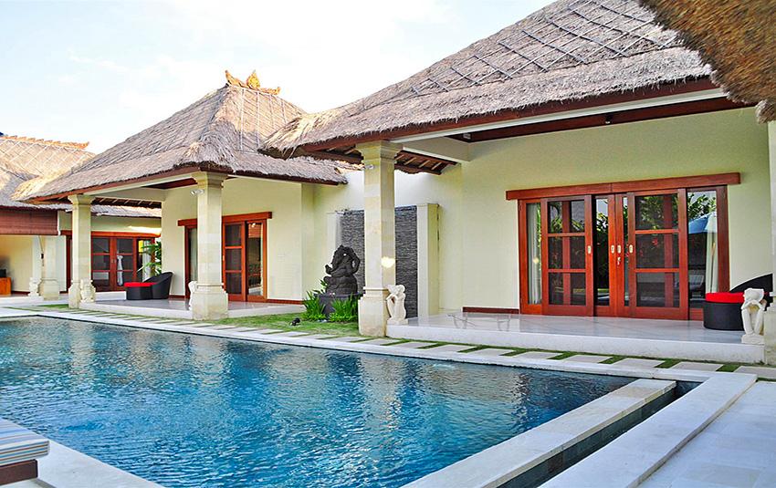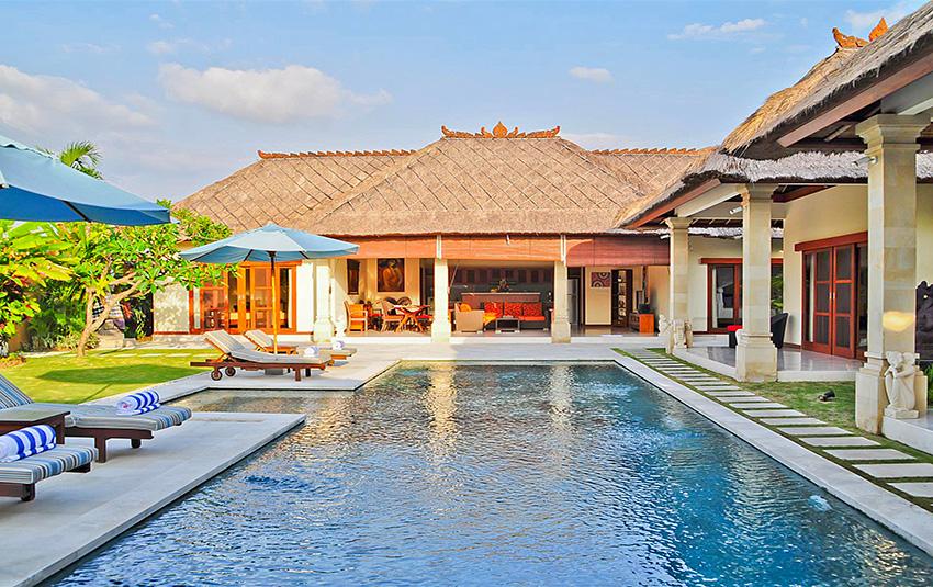 Large and luxury villa in Seminyak, Bali, Indonesia with private pool for 8 persons. The villa is situated in a residential beach area, close to restaurants and bars, shops and supermarkets and at 500 m from Gado Gado beach. The villa has 4 bedrooms and 4 bathrooms. The accommodation offers a lot of privacy, a wonderful lawned garden with trees and a wonderful pool. Its comfort and the vicinity of the beach, places to shop and places to go out make this a perfect villa to celebrate your holidays with family or friends.