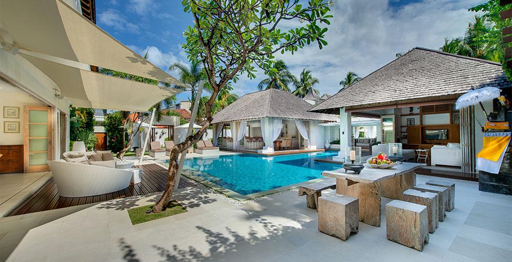 Grande villa de luxe avec piscine privée à Seminyak, Bali, Indonésie pour 8 personnes. La villa est située dans une région résidentielle et à 2 km de la plage de Seminyak.