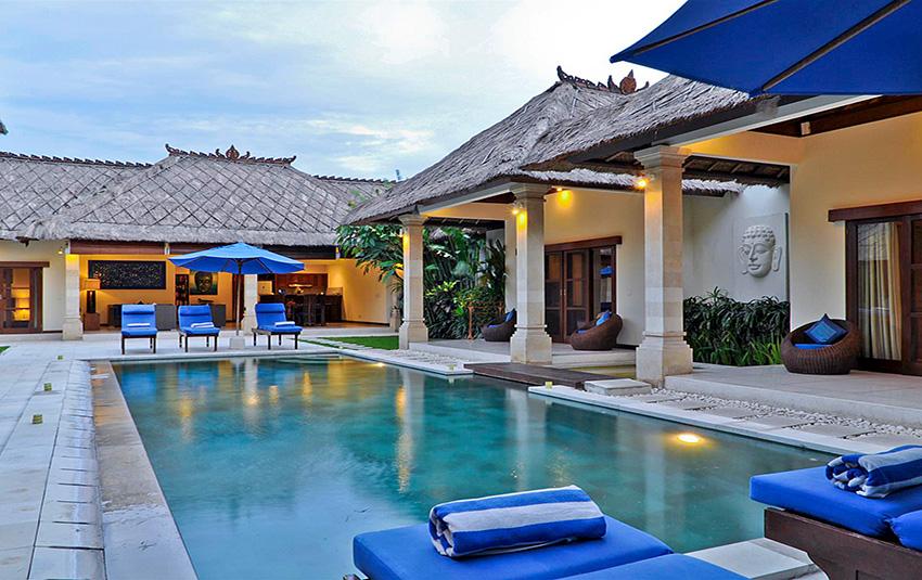 Grande villa de luxe à Seminyak, Bali, Indonésie avec piscine privée pour 8 personnes. La villa est située dans une région balnéaire et résidentielle, près de restaurants et bars, de magasins et de supermarchés, à 500 m de la plage de Gado Gado et à 0,5 km de Indian Ocean.